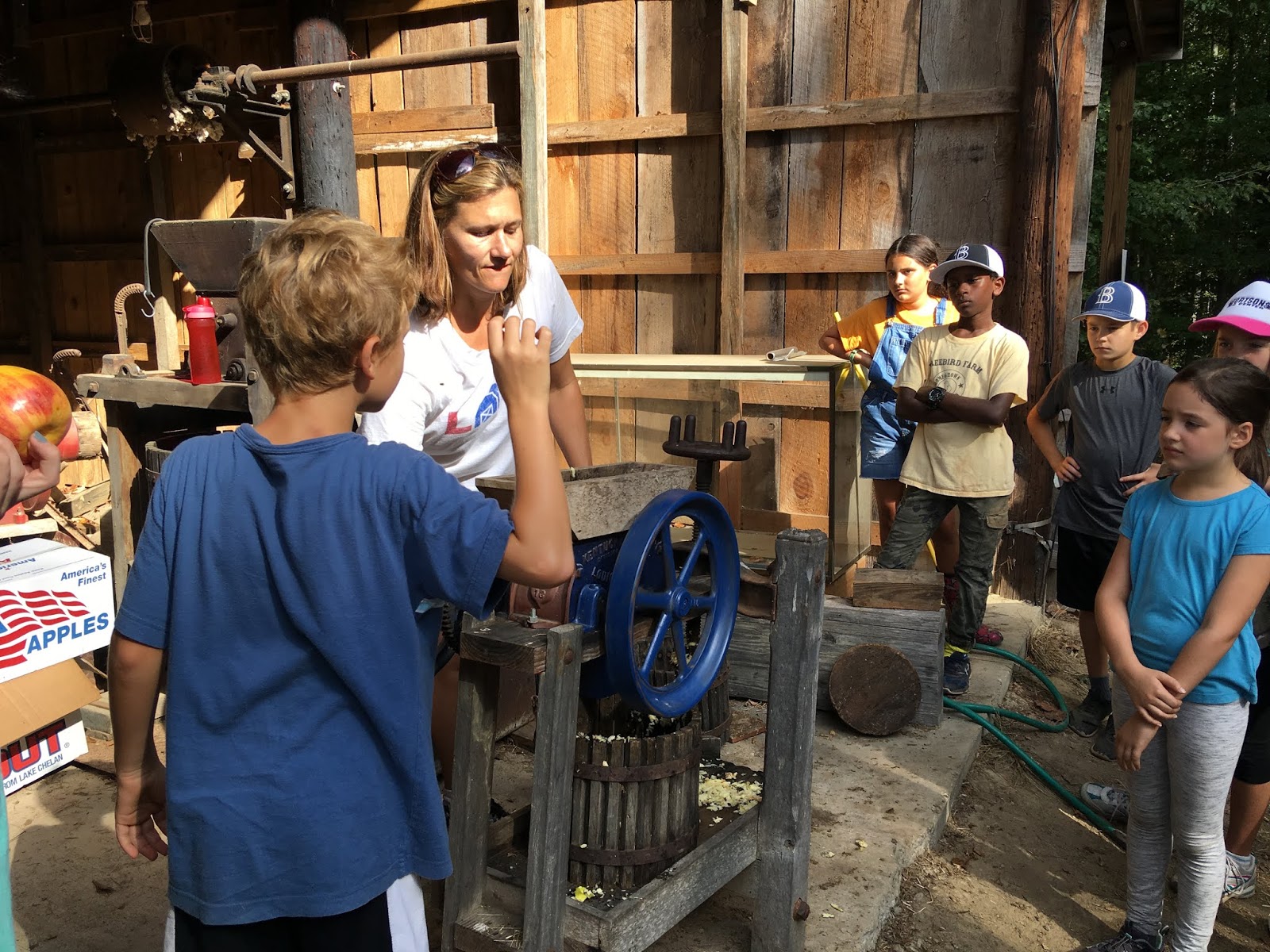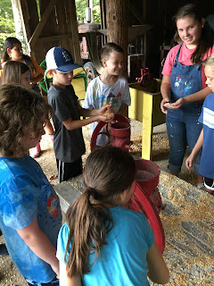 Today was a bit different than our typical day. After each group completed their animal care tasks, we washed hands and jumped on a hay ride! Mr. Rick from Minter's Farm picked us up and hauled us the 1/2 mile down the road to Minter's Farm. Each year, the Minters, along with the help of some amazing friends and family, manages to host Inman Farm Heritage Days. The festivities went on all weekend, but Rick graciously allowed me to bring the kids down for a private tour! I demonstrated the apple cider press, and the class was able to drop in apples and see them pressed into cider. We squeezed sorghum, as well! I had no mule or horse... or even a tractor... so the kids stepped up and ran the cane press themselves. We collected the liquid, and I explained how the syrup was made right there all weekend long! We toured the weaving room, and the kids were able to see a mop-making machine. The wooden handle was held in place and a foot pedal controlled the spinning. The mop yarn was help in place by wire, dispensed at the back of the machine. The class was also able to see an authentic antique loom! We toured the grounds for a while before heading back up to our farm. It was an absolute JOY to see these kids down there experiencing a bit of the past!